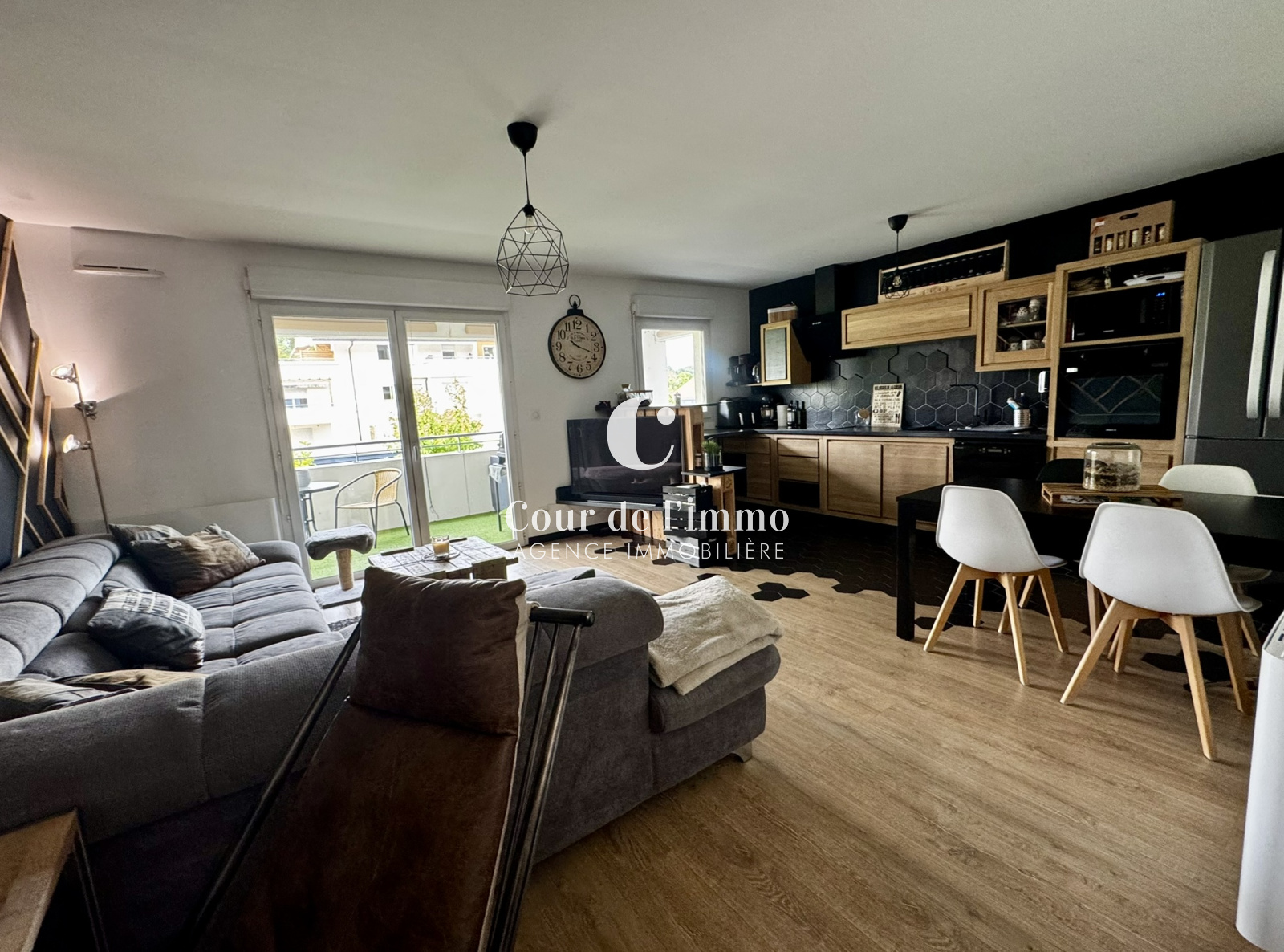 En exclusivité, idéalement situé au centre de BONNE et proche de toutes commodités (commerces, écoles, accès autoroutiers, bus de ville), dans une résidence sécurisée, bel appartement T3 traversant de 69.59m² Loi Carrez au 1er étage, entièrement rénové avec goût, comprenant :