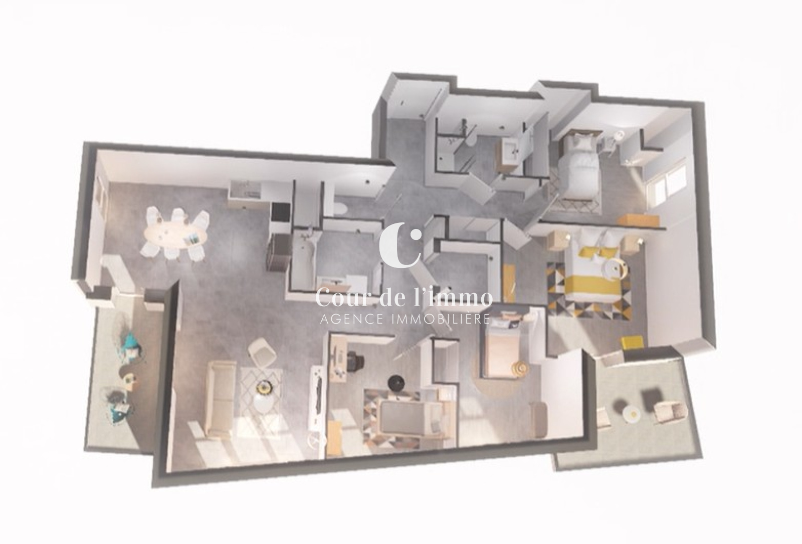 Entrée / dégagement avec placard donnant, un cellier, accès à une grande pièce à vivre avec deux balcons de 9m² et 10m², 4 chambres, une salle de bain, une salle d'eau et un WC séparé.