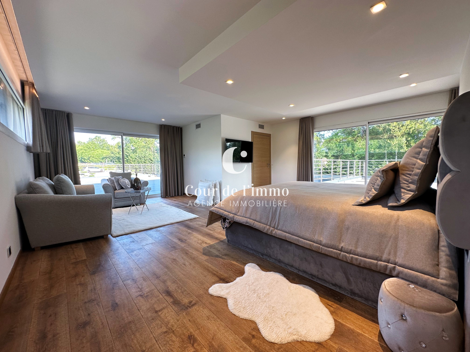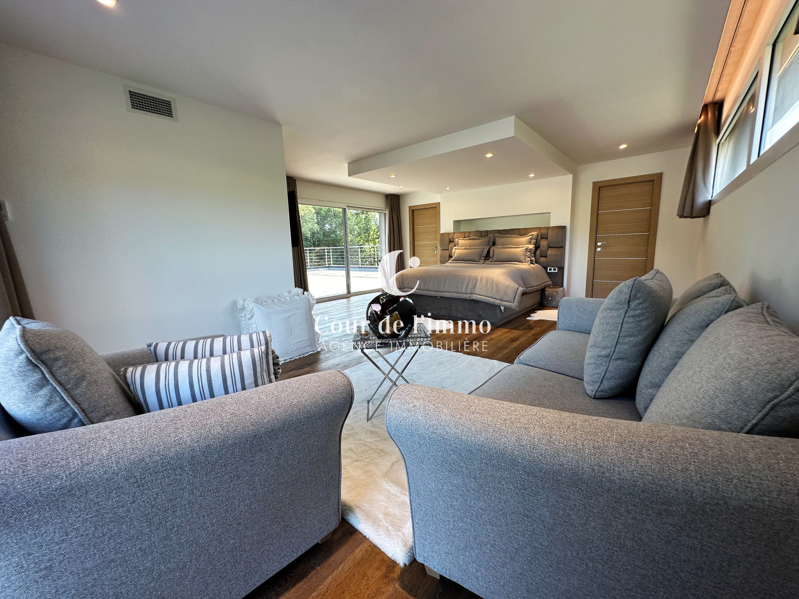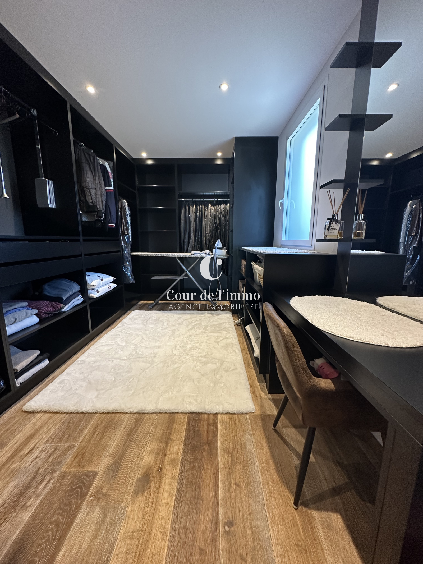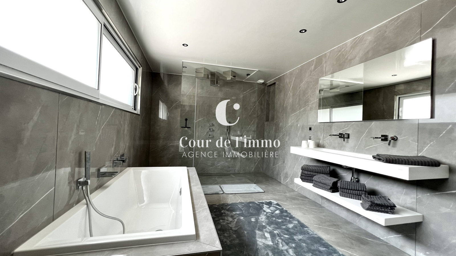 La maison se compose, au rez-de-chaussée, d'une entrée desservant une grande pièce à vivre avec cuisine équipée ouverte sur le séjour, 2 grandes chambres avec salle d'eau et dressing communiquant, une grande chambre avec salle d'eau et WC séparé. A l'étage : une grande suite parentale avec salle de bains, dressing et accès à la terrasse (172,50m²).