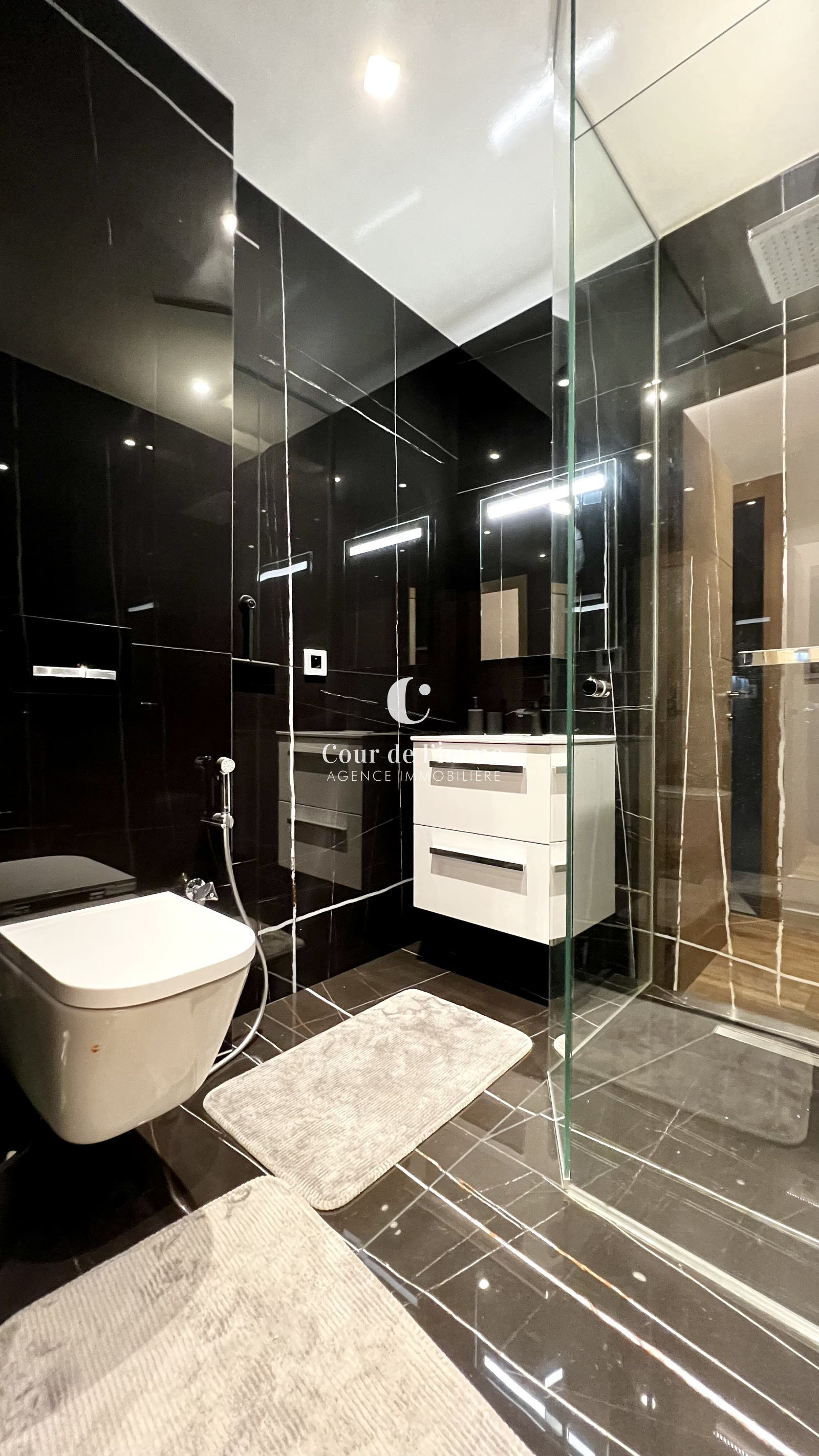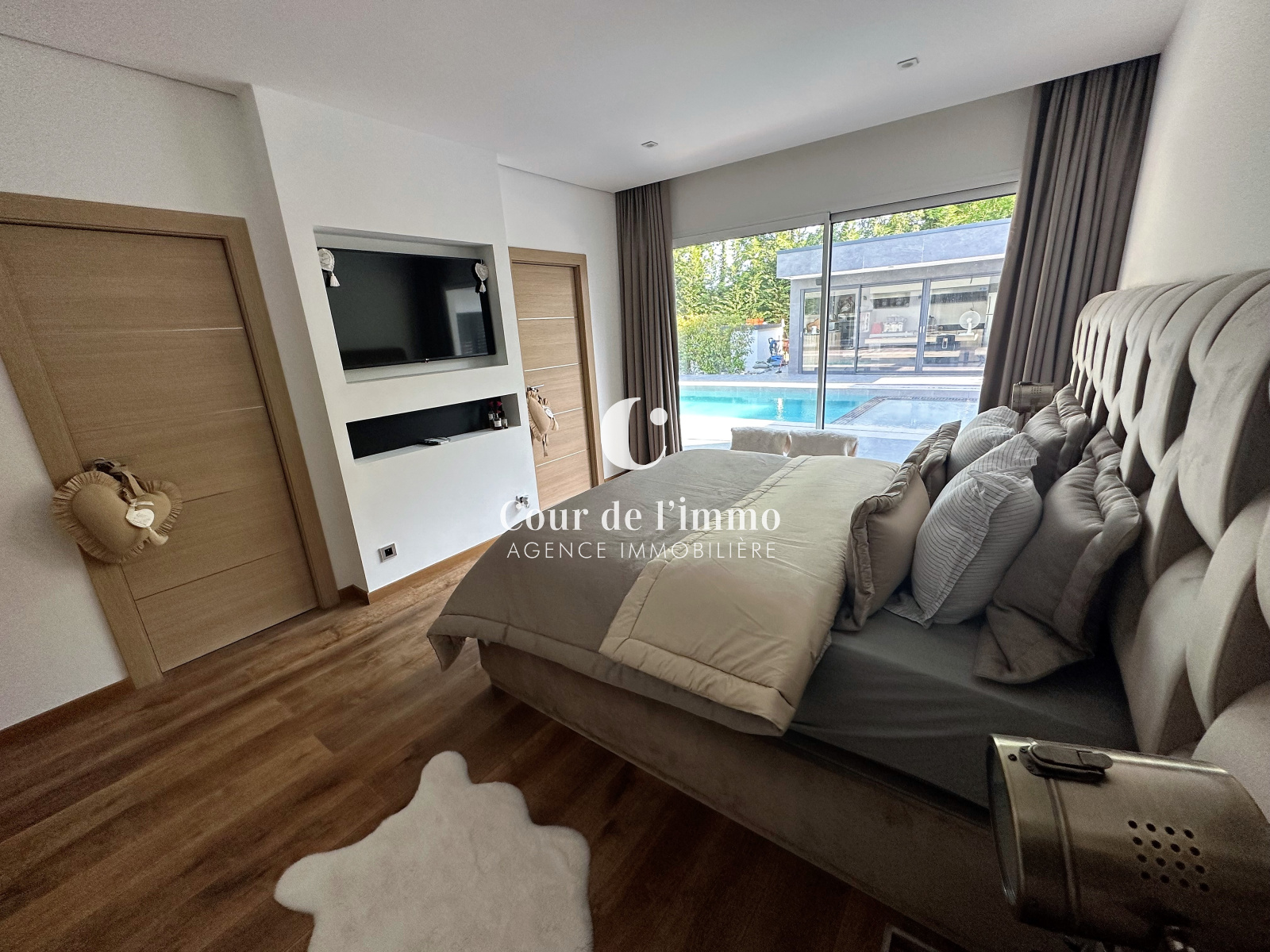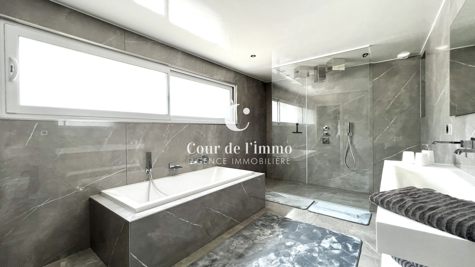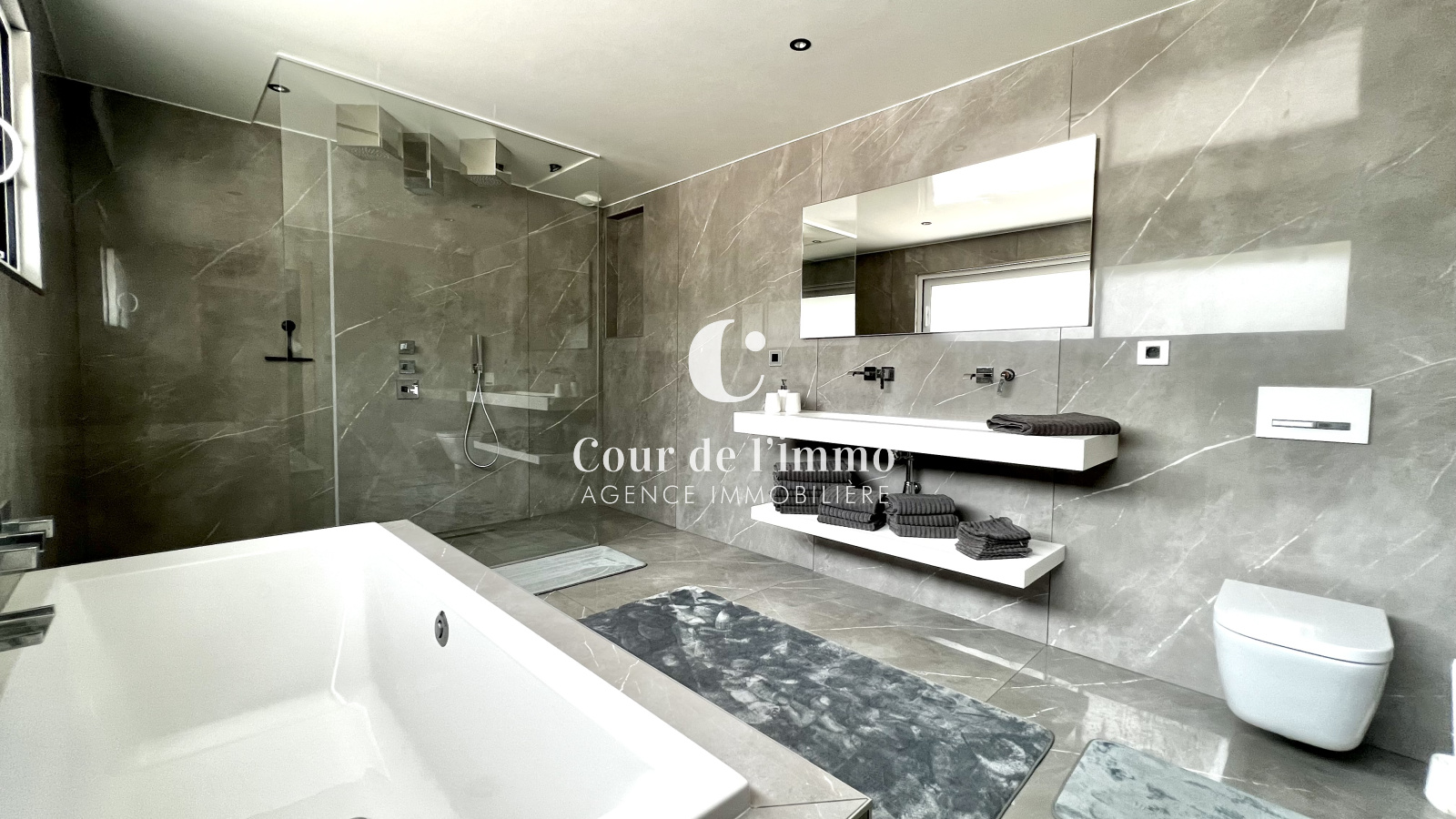 La maison se compose, au rez-de-chaussée, d'une entrée desservant une grande pièce à vivre avec cuisine équipée ouverte sur le séjour, 2 grandes chambres avec salle d'eau et dressing communiquant, une grande chambre avec salle d'eau et WC séparé. A l'étage : une grande suite parentale avec salle de bains, dressing et accès à la terrasse (172,50m²).