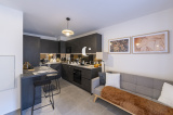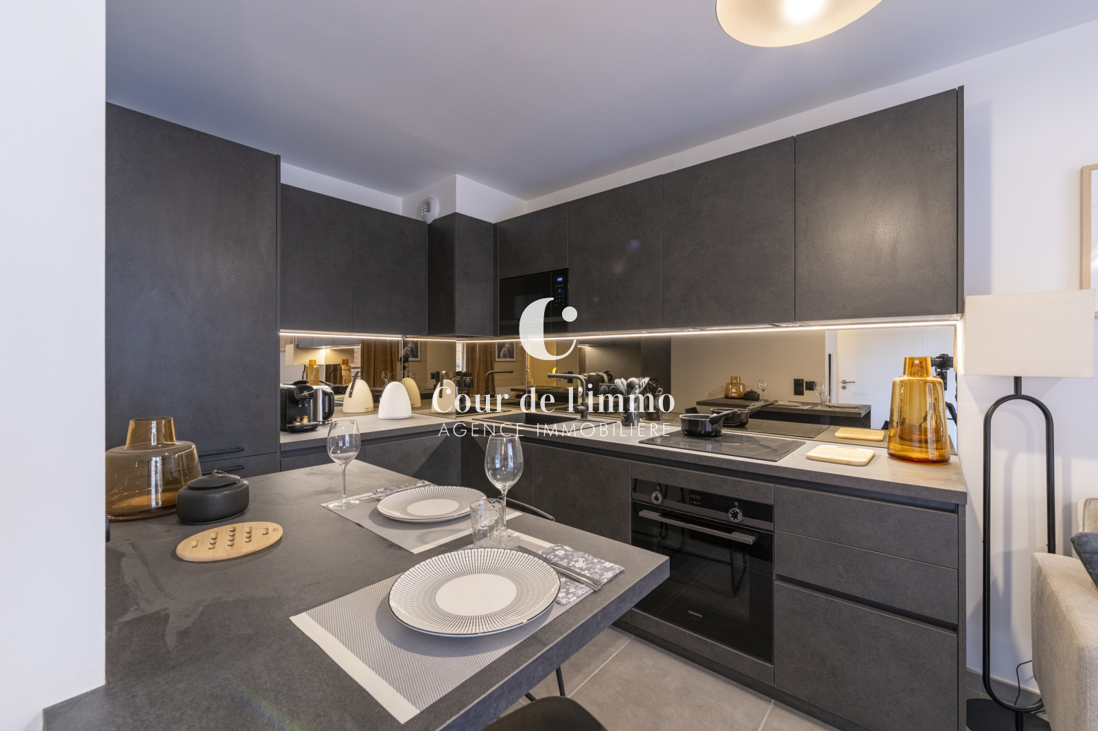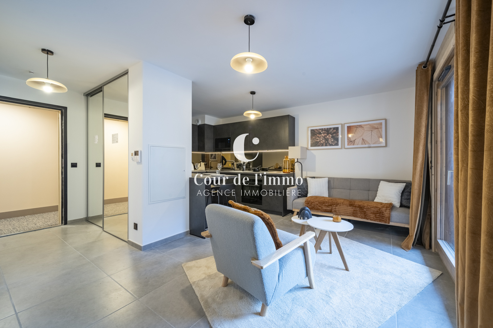 L'appartement est composée d'une cuisine entièrement équipée, ouverte sur la pièce de vie lumineuse offrant un accès à un balcon de 3,40 m² (EST).
