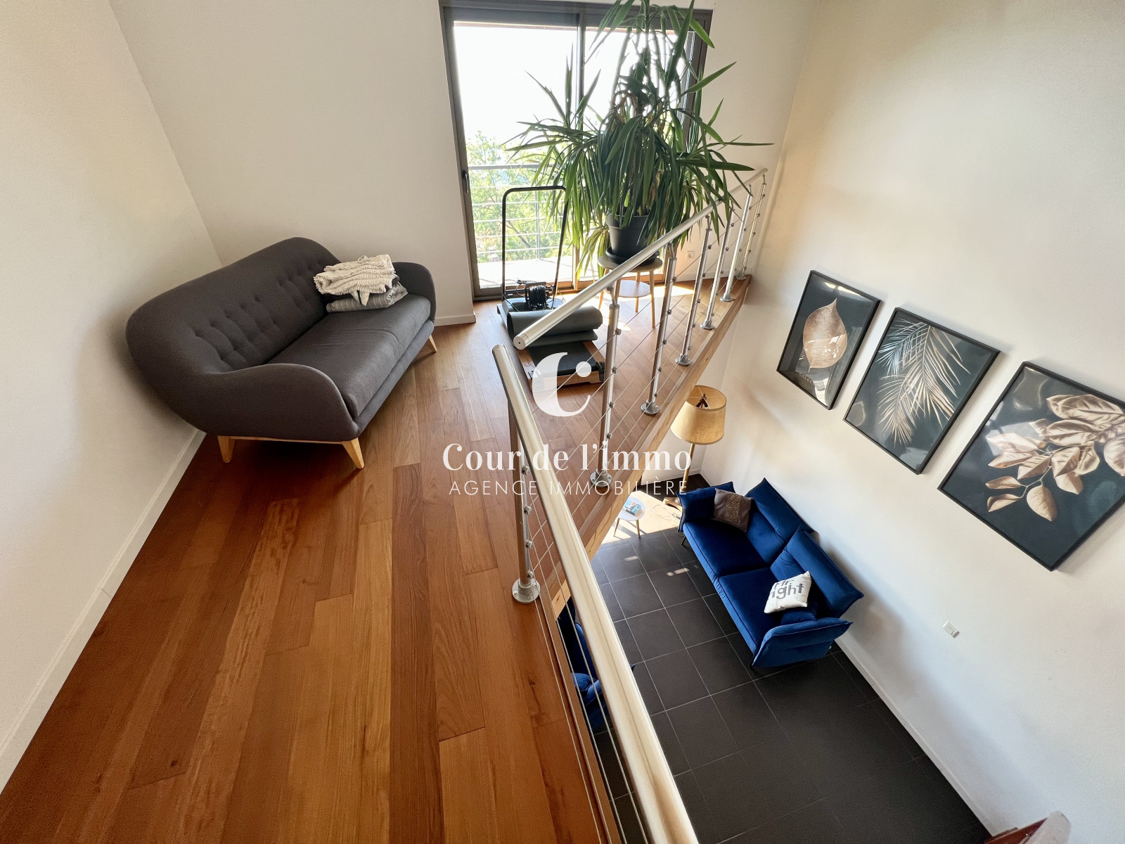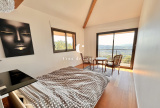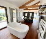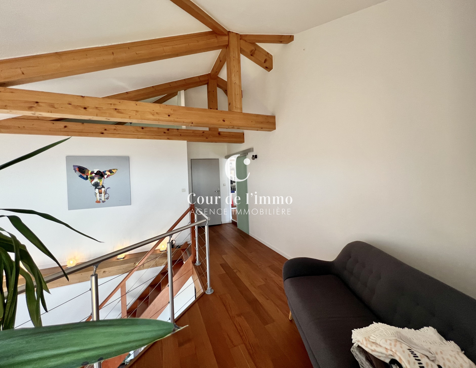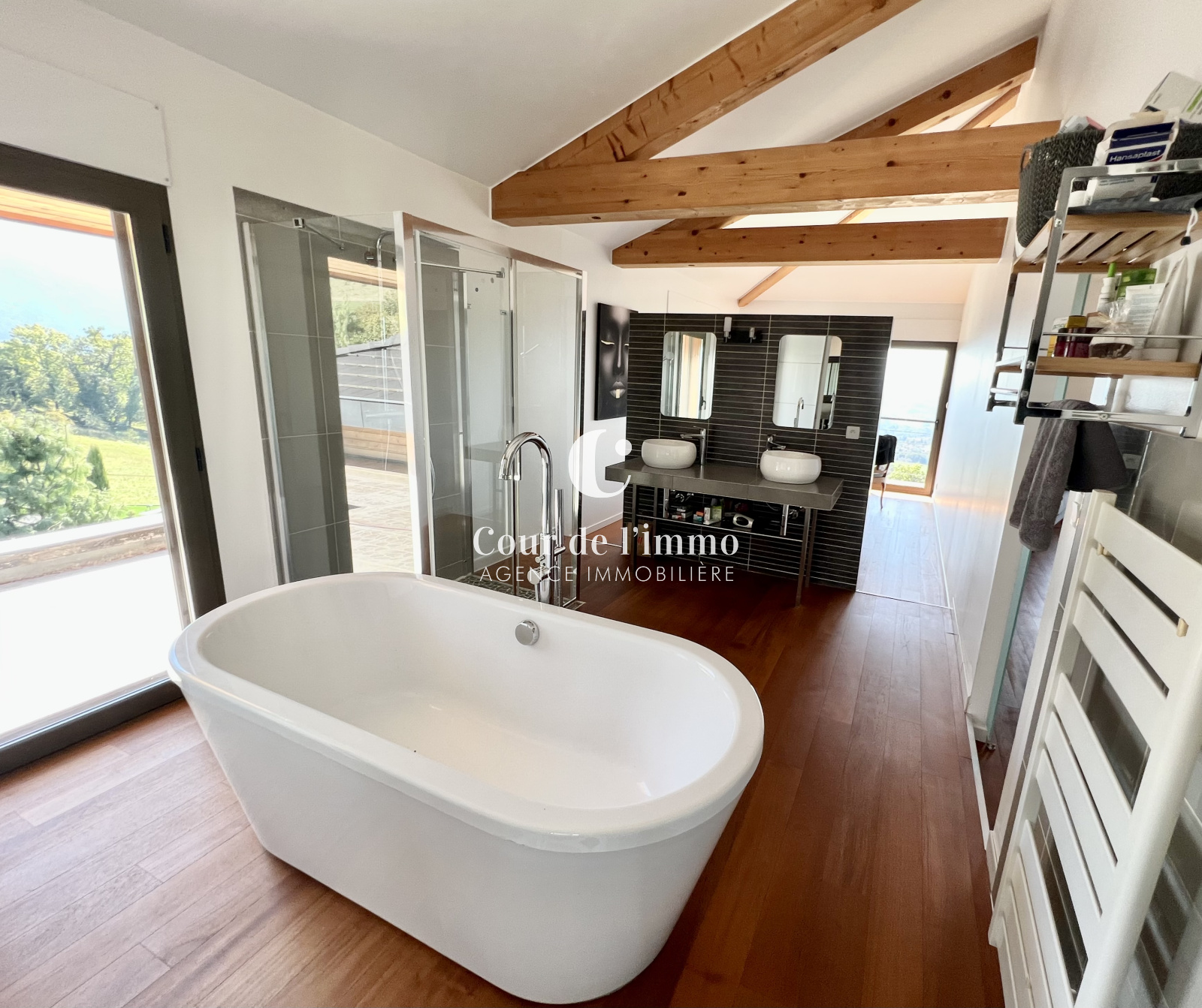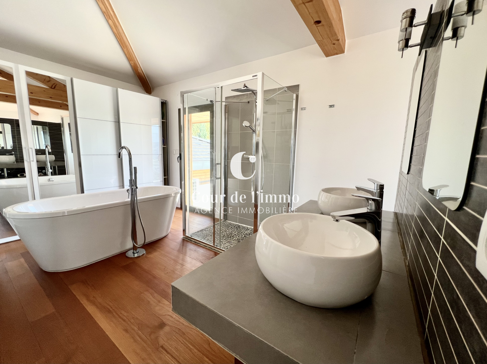A l'étage : mezzanine, 2 chambres dont une suite parentale avec salle de bain (double vasque, douche et baignoire, accès au balcon et au toit-terrasse), wc avec lave-main complète l'étage.
